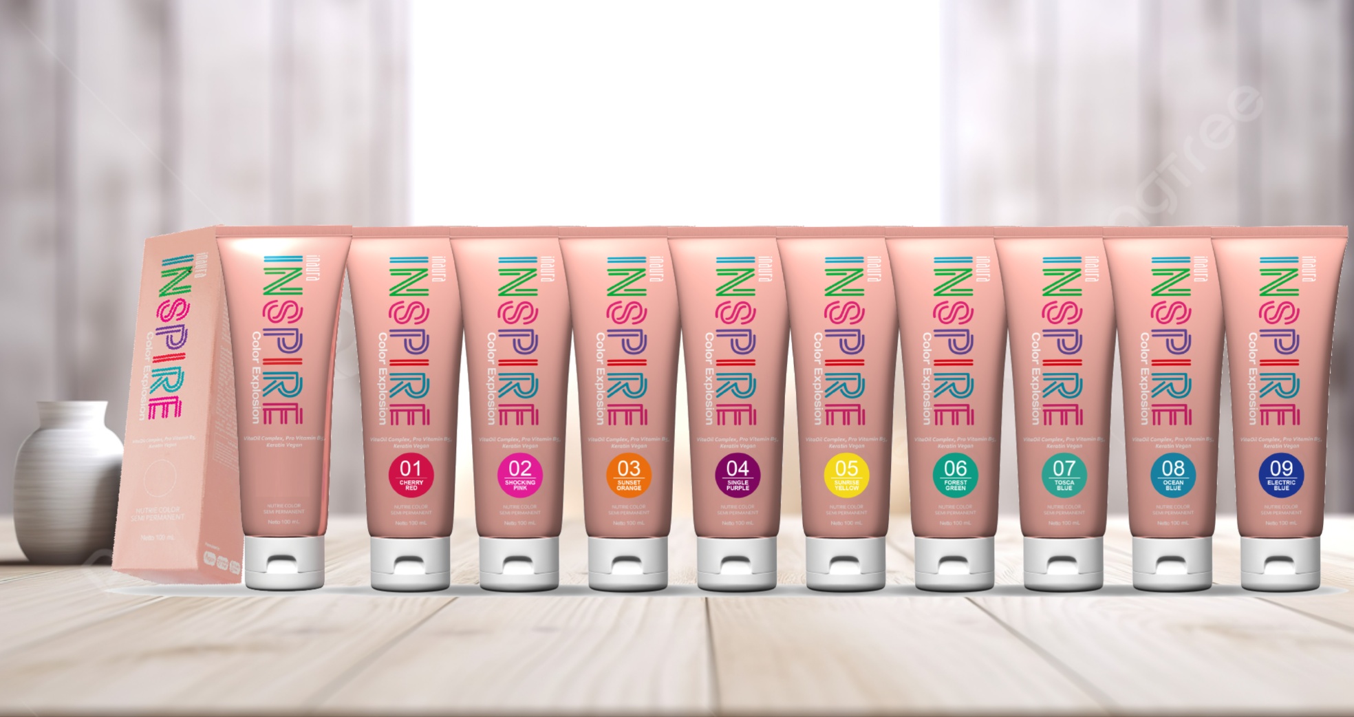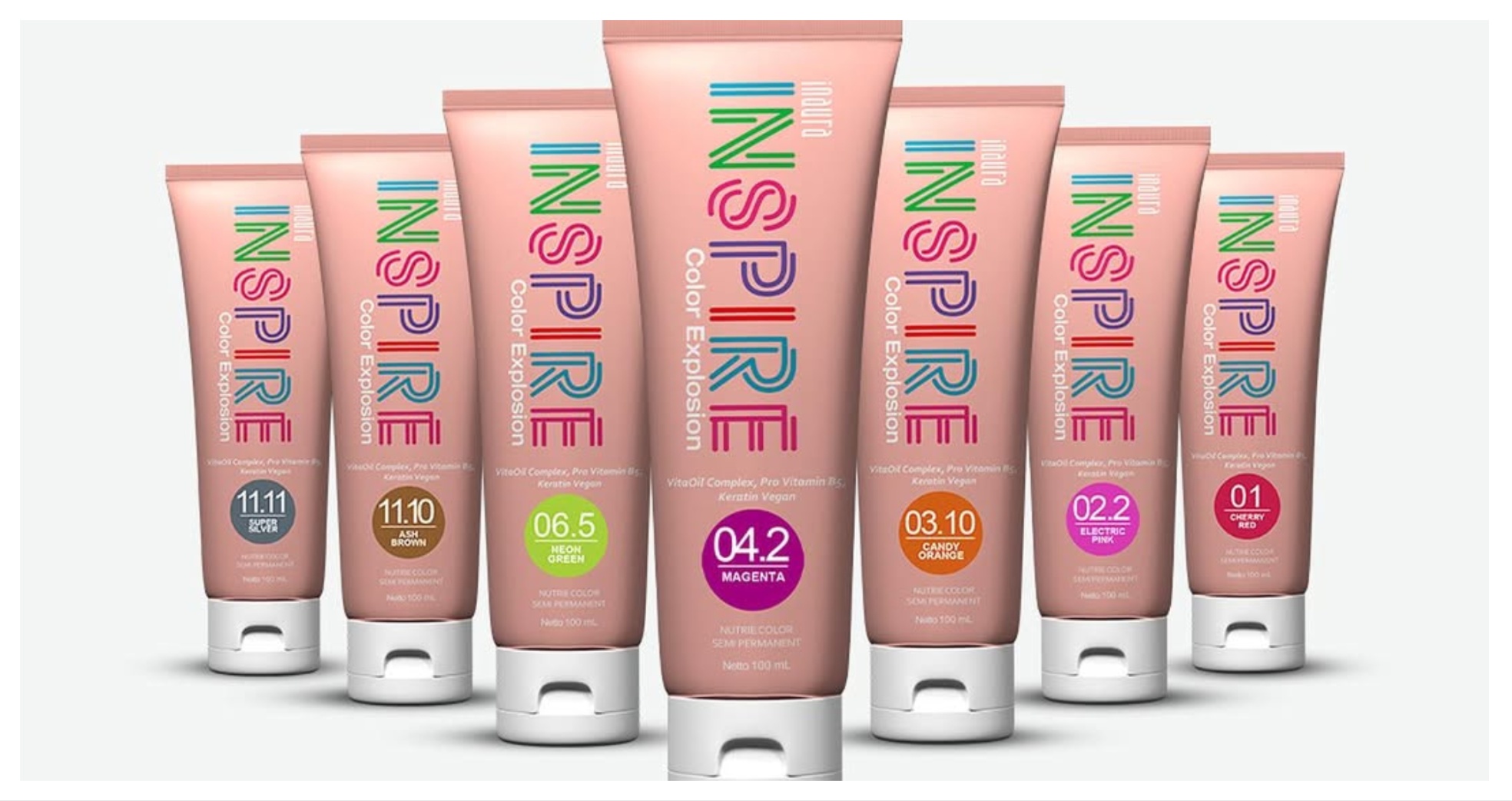 Inaura Color Explosion adalah semi permanent color yang mengandung Hydrolized Keratin, Vitamin E, Aloevera Extract, Rice Bran Extract yang berfungsi untuk menutrisi rambut saat proses pewarnaan.
