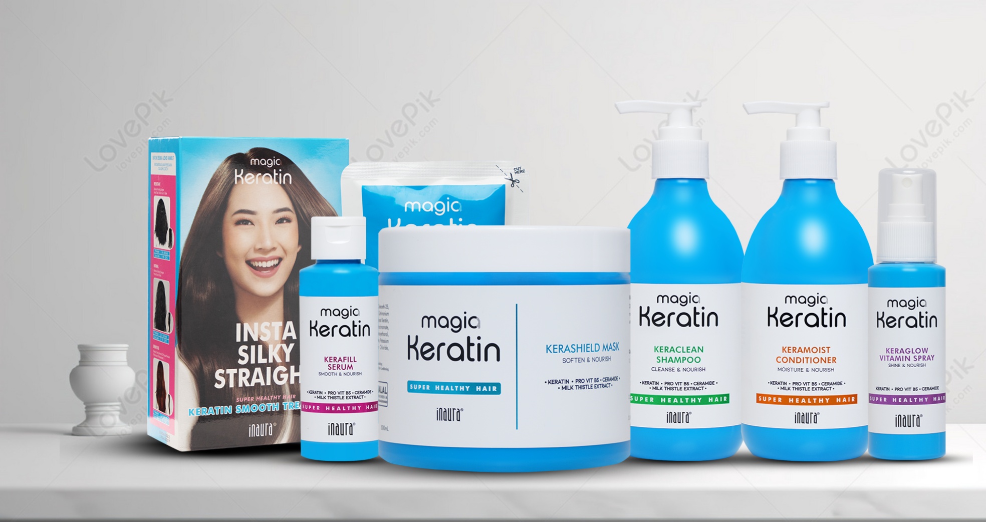 Serangkaian produk perawatan rambut dari merek Inaura yang diformulasikan dengan keratin untuk menutrisi, menguatkan, dan membuat rambut lebih sehat dan berkilau